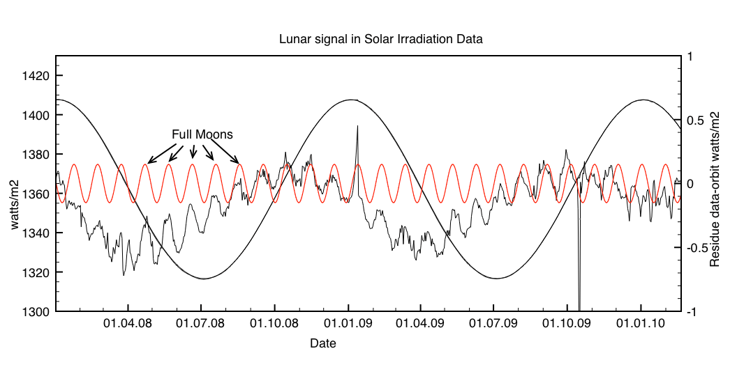 I emailed Greg Kopp (lead scientist on SORCE-TIM) last January about the lunar signal that pops out once the Earth’s elliptic orbital effects have been subtracted. He was kind enough to reply, explaining their analysis, thus both earning my deep respect for his scientific integrity and the professionalism of the TIM group’s data analysis. His reply helps explain the TSI data processing.