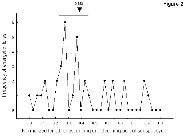 ‘The 11-year sunspot cycle is not built symmetrically. The ascending part from minimum to maximum is shorter than the declining part from maximum to minimum. I have shown that the sunspot maximum divides the sunspot cycle according to the Golden section. It falls at the minor of this special irrational proportion. The Golden section divides a frame structure like a line segment, a surface, a cycle, or any other delimited feature so that the ratio of the smaller part (minor) to the larger part (major) equals the ratio of the larger part to the whole. When we set the whole equal to 1, we get 0.3819 … : 0.618 … = 0.618 … : 1. To find the major of the length of a cycle, it has to be multiplied by 0.618. Multiplication by 0.382 gives the minor.’