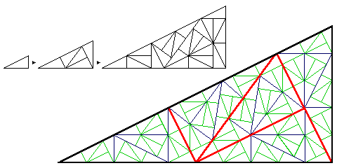 “Incidentally, it was Lorenzo A. Sadun who proposed that the pinwheel tiling could be generalized to other right triangles if one allows a tiling with different sizes of triangles in it […] In the diagram, the original 1:2:sqrt(5) triangle is shown, with a different triangle, the 3:4:5 triangle, below it. The two acute angles are still not integer parts of a circle; triangles whose angles are integer parts of a circle could also be chosen, to create triangle tilings that could be the basis for tilings with any desired order of symmetry.”