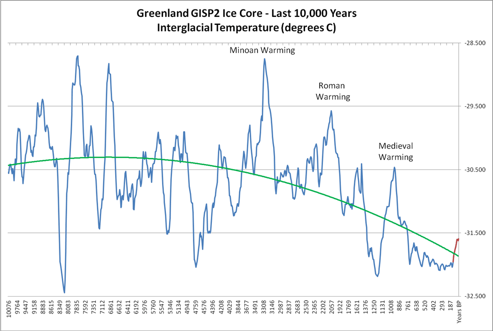 That’s Greenland, and the really warm bits like around 1200BC were so cold/dry in the mid latitudes that most of the cultures that expanded from 2700BC onwards, collapsed permanently, including the Minoans who that warm spike in GISP around 1200BC is erroneously named after.