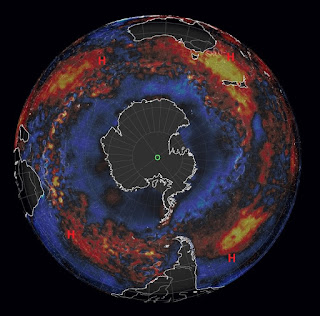 SST Anomaly 19/12/2017 showing the prominent N=4 standing-wave like pattern. Four “H” symbols are superimposed on this plot to show the location of the enhanced semi-permanent high pressure cells in the Southern Sub-Tropical High Pressure Ridge.