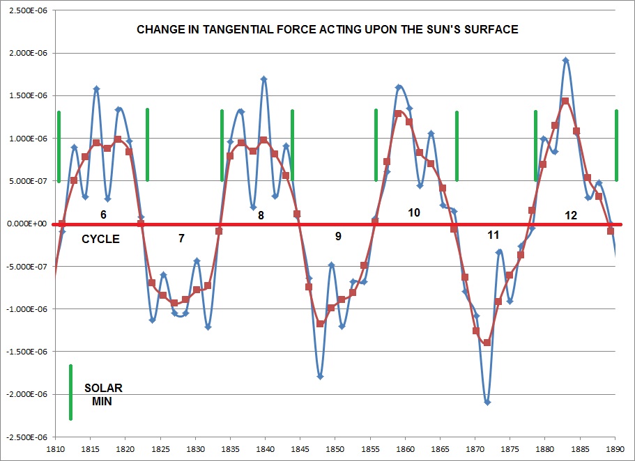 If the next solar minimum is at the end of 2020 to the start of 2021, it will mark the resynchronization of the solar minimums with the maximum change in Jupiters tangential force acting on the Earth-Venus tidal bulges on the Sun.