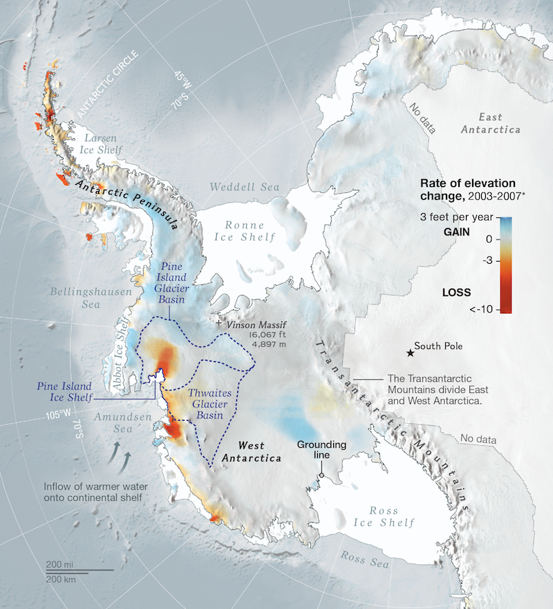 This ice stream in the west of the continent is comparable in size to Britain. It is melting and is currently in rapid retreat, accounting for around 4% of global sea-level rise – an amount that has doubled since the mid-1990s.
