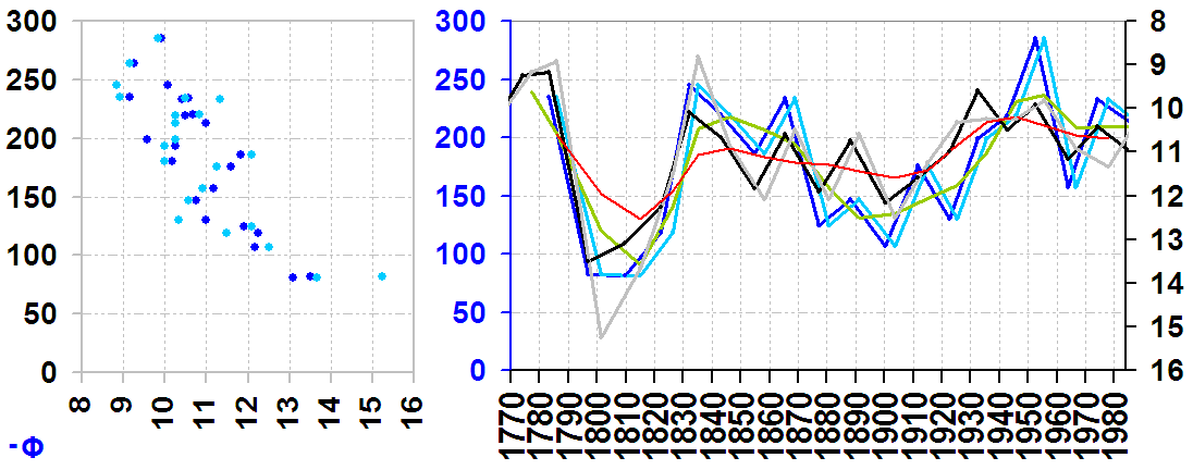 Table 1 List of sunspot cycles, with their peak SSN, the times of their terminators (rounded to the nearest month and expressed as a decimal year), and the difference between subsequent terminators (ΔT; yr). Recall that by definition the terminator of sunspot cycle N occurs during the rise phase of sunspot cycle N+1. [bold added]