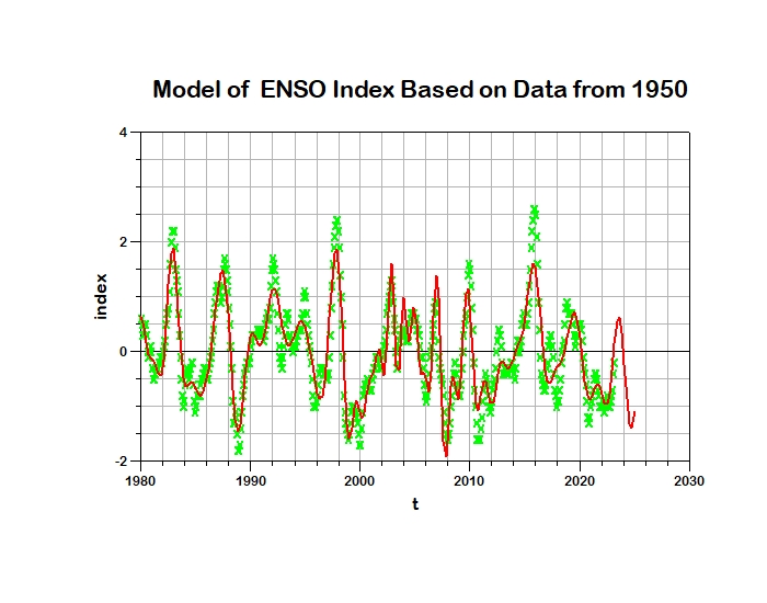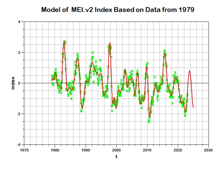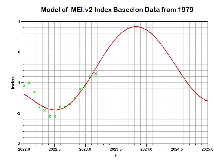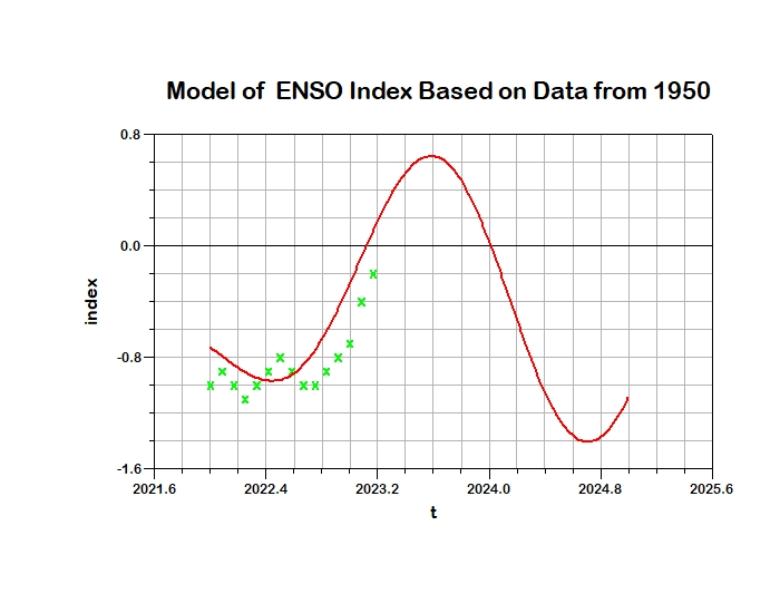 Below are two models regarding El Nino that (because of the high degree of auto correlation in the data) may make valid predictions over the short term of one to two years. The models using the ENSO and the MEI.v2 data predict a mild one year El Nino starting in 2023 and ending in 2024.